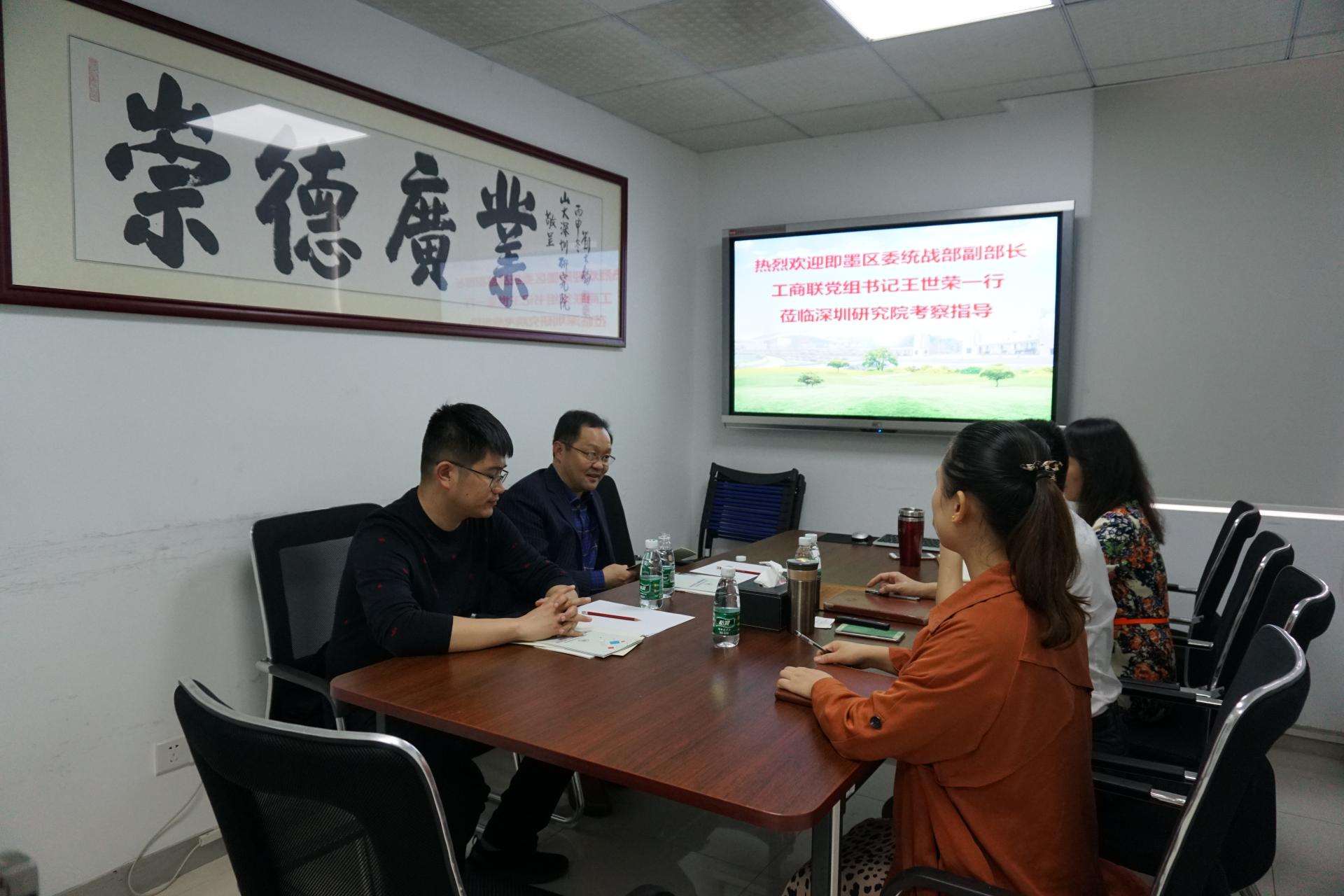12月6日,青岛市即墨区委统战部副部长、工商联党组书记王世荣一行2人到深圳研究院考察调研。深圳研究院常务副院长兼合作发展部副部长王明星陪同接待并进行了座谈。