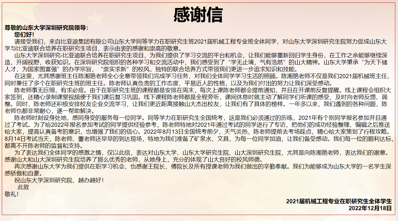 2022年,300余名比亚迪学子在山大成功深造,实现了专业能力、学历水平、工作素养的全面提升。12月18日,研究院收到比亚迪2021级机械工程专业班全体在职研究生的感谢信,字里行间传递着温暖与感动。