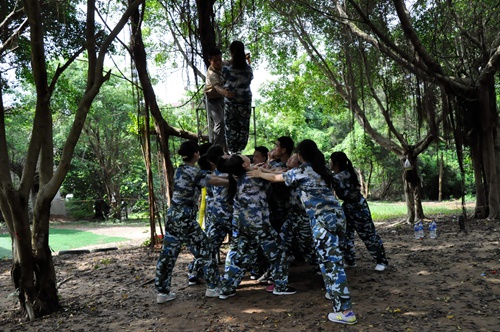 同学们换上基地统一的迷彩服,听从教官的指令,首先进行一系列互动游戏。通过破冰游戏,大家相互记住了其他同学的姓名与专业。接着,同学们随机分成两小队,选举出队长,并为各自的队伍选取了队名、口号与旗帜。随后,同学们开始了正式的训练:进行了传递正能量、拍数字、指挥作战等团队游戏。这一系列游戏培养了同学们及时解决内部矛盾的应变能力和顾全大局的凝聚力。下午进行了“背摔”、大脚板等项目训练,增强了大家的相互信任,让彼此间联系更加紧密。下午五点半左右,拓展训练顺利结束。