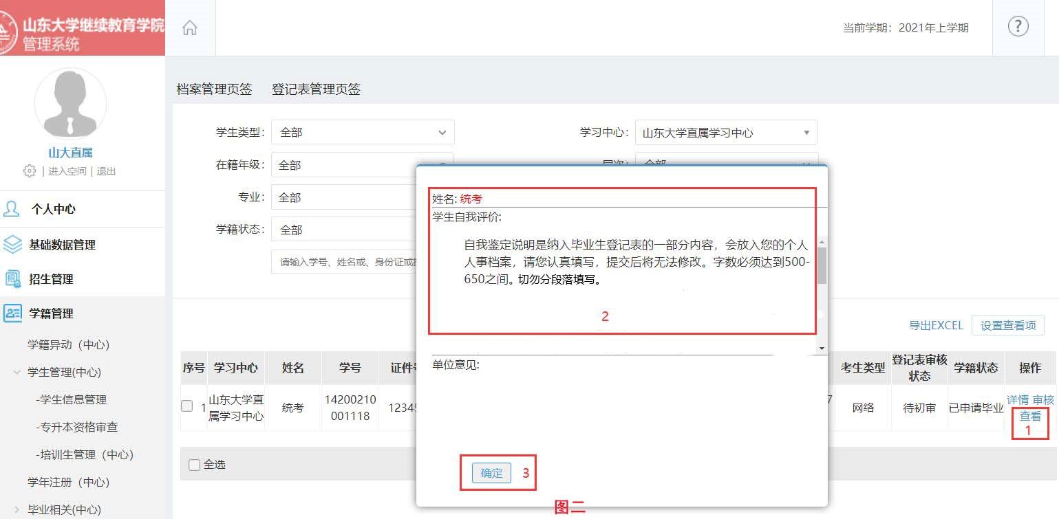 学习中心、函授站负责老师须通过“档案管理(中心)”(图一)对“已申请毕业”的学生进行“自我鉴定”(图二)和“毕业资格”(图三)初审。